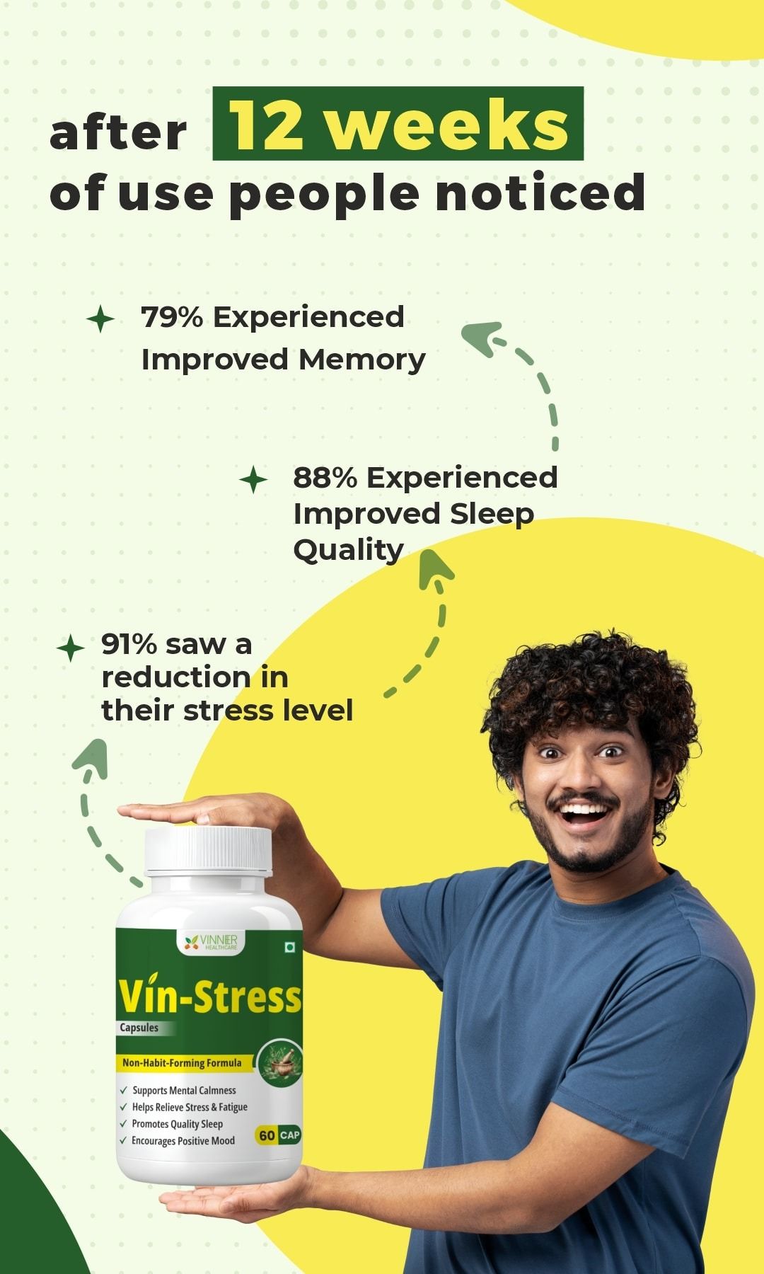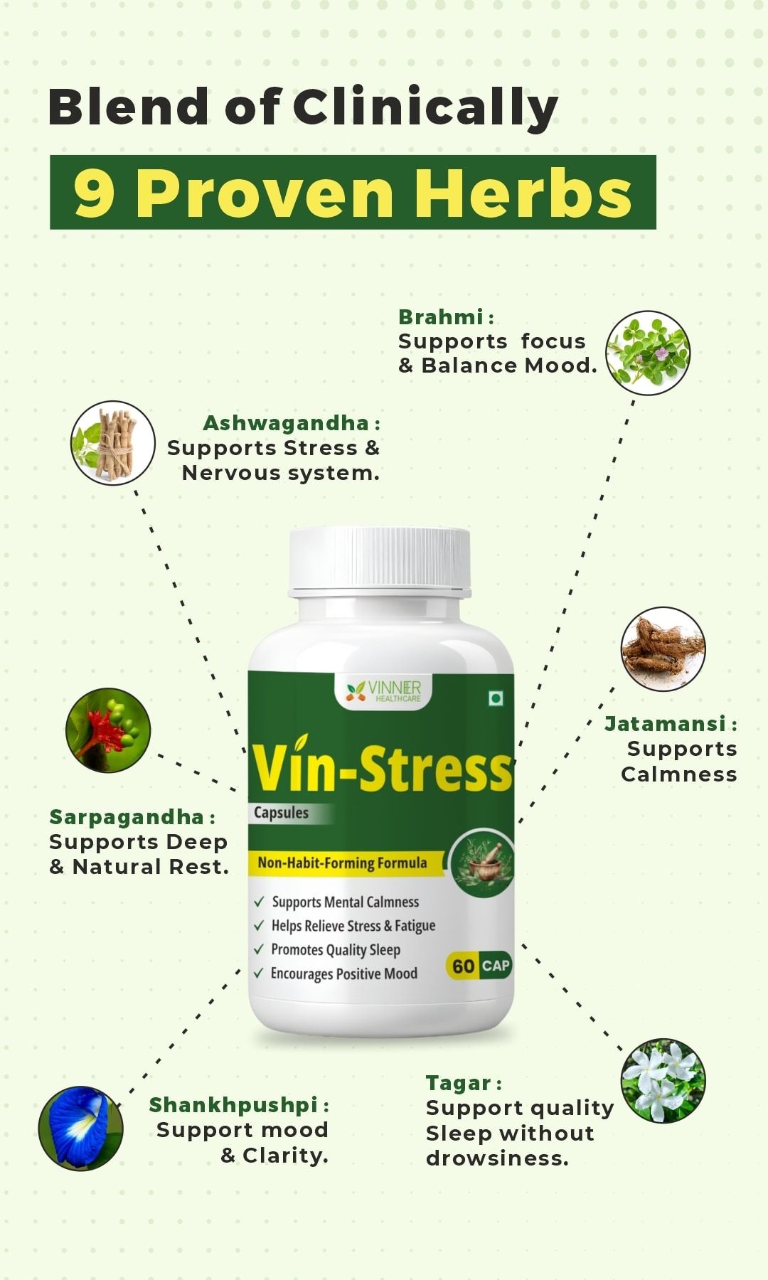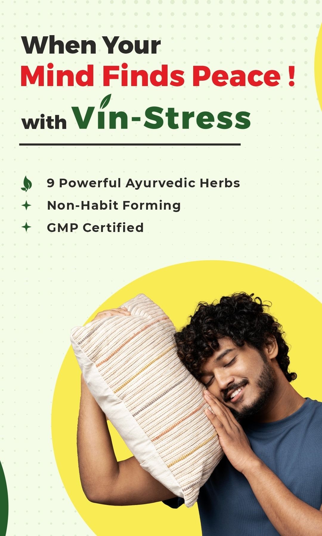 Vin-Stress is a 3-in-1 Ayurvedic supplement formulated with 9 time-tested herbs like Jatamansi, Ashwagandha, Brahmi, Shankhpushpi, and more. It helps support restful sleep, emotional balance, and a calm, focused mind—without habit-forming ingredients or side effects.